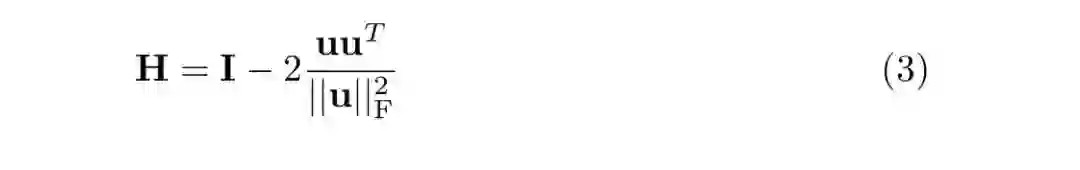 矩阵 H 沿垂直于与 u 正交的超平面的方向反映向量 u。此属性可用于通过顺序反映每一行和每一列来对对称矩阵进行三对角化。Householder 反射通过以下方式计算: