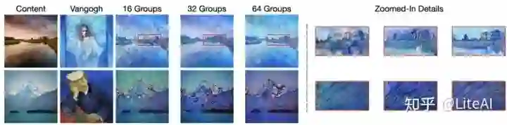 与 [9] 中的发现类似,我们还观察到组的数量影响风格迁移的程度。如图 7 所示,当使用更多组时,迁移图像中的风格变得更加可区分,细节也得到了更好的保留。由于组的数量决定了划分通道的数量和协方差大小,因此更多的组对应于较小的协方差,这可能有助于更好地捕获局部结构。尽管有这种表面的猜想,但给出更全面、更严谨的分析还是值得进一步研究的。