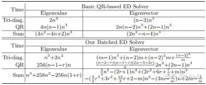 表 1 总结了基于 QR 的基本 ED 求解器和我们提出的专用于批处理矩阵的 ED 求解器的时间复杂度。采用最高阶项进行更简单的分析,我们的 ED 求解器将计算特征值的时间从 O(4