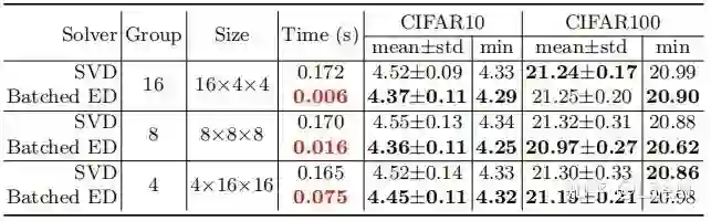 以消除各个维度之间的相关性。我们将 ZCA 白化元层插入 ResNet-18 [22] 架构,并评估 CIFAR10 和 CIFAR100 [28] 上的验证误差。表 2 比较了我们的批处理 ED 与 SVD 的性能。根据组的数量,我们的方法可以比 SVD 快 2 倍、10 倍甚至 28 倍。此外,我们的方法在 CIFAR10 上的所有指标上都优于 SVD。使用 CIFAR100,性能也相当。