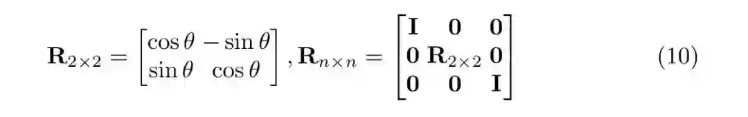 可以看出,单次 QR 迭代等效于执行正交相似度变换。通过执行迭代,次对角线和超对角线元素逐渐减少,直到矩阵变为对角线。对于每次 QR 迭代,我们使用 Givens 旋转从左上角移动到右下角逐渐构造正交变换。2×2 Givens 旋转及其 n×n 扩展定义为: