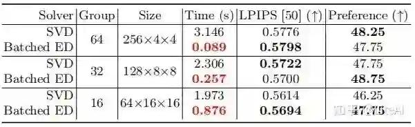 表 4 给出了与不同组的定量比较。我们的批处理 ED 实现了极具竞争力的性能并在速度上占主导地位。举一个具体的例子,当组数为 64 时,我们的方法比默认的 SVD 快大约 35 倍。