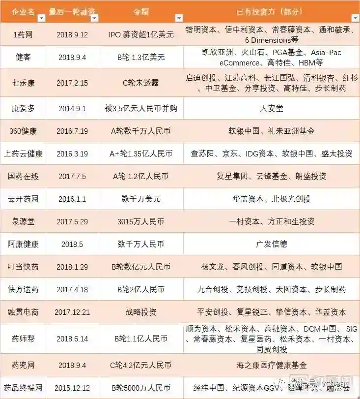 偌大的医药电商市场,资本玩家不少,大一点的是云锋、复星、IDG、经纬、软银、北极光,小一点的基金及个人投资者也有。医药电商既有互联网属性,又有零售属性,线下投入很重要,是个“重”模式。