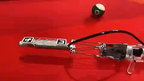 Wighton 所预想的系统是这样的:首先,在球桌的上方安装一个摄像头,用于记录球桌上的基本情况;这个摄像头与一个「大脑」相连,后者可以利用算法,根据摄像头拍摄到的信息计算出最佳击球路线;最后,构建一个末端可以活动的球杆,帮助玩家完成击球动作。