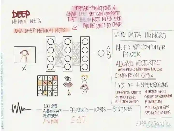 右边: 深度网络的特点是需要大量的训练数据和计算资源,其中涉及大量的矩阵运算,可以在 GPU 上并行执行,还包含了大量的超参数,例如学习率、迭代次数、隐藏层数、激活函数选择、学习率调整方案、批尺寸大小、正则化方法等。