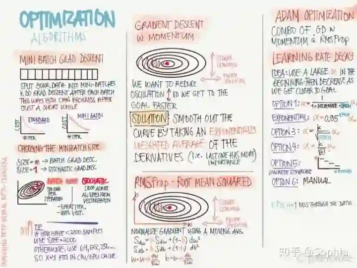 上图后面所述的 RMSProp 和 Adam 等适应性学习率算法是目前我们最常用的最优化方法。RMSProp 算法(Hinton,2012)修改 AdaGrad 以在非凸情况下表现更好,它改变梯度累积为指数加权的移动平均值,从而丢弃距离较远的历史梯度信息。RMSProp 是 Hinton 在公开课上提出的最优化算法,其实它可以视为 AdaDelta 的特例。但实践证明 RMSProp 有非常好的性能,它目前在深度学习中有非常广泛的应用。