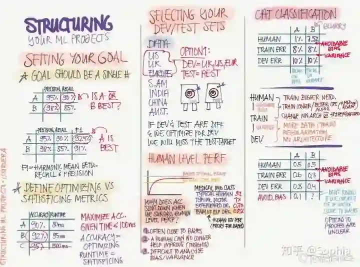 我们需要按过程或结构来设定我们的机器学习系统,首先需要设定模型要达到的目标,例如它的预期性能是多少、度量方法是什么等。然后分割训练、开发和测试集,并预期可能到达的优化水平。随后再构建模型并训练,在开发集和测试集完成验证后就可以用于推断了。