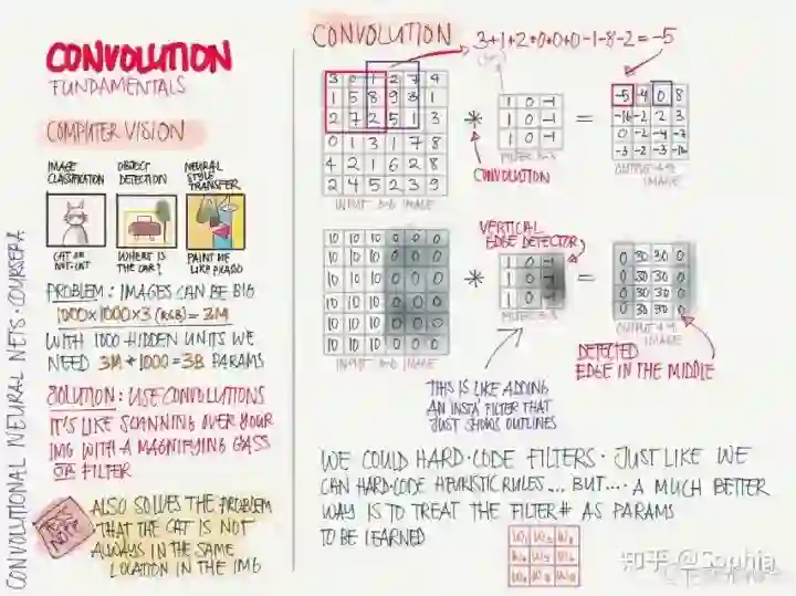 计算机视觉任务涉及的数据体量是特别大的,一张图像就有上千个数据点,更别提高分辨率图像和视频了。这时用全连接网络的话,参数数量太大,因而改用卷积神经网络(CNN),参数数量可以极大地减小。CNN 的工作原理就像用检测特定特征的过滤器扫描整张图像,进行特征提取,并逐层组合成越来越复杂的特征。这种「扫描」的工作方式使其有很好的参数共享特性,从而能检测不同位置的相同目标(平移对称)。