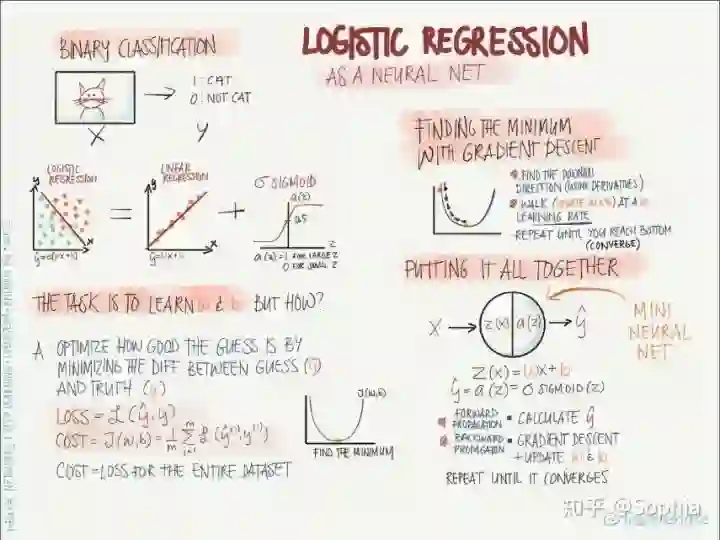 左上: logistic 回归主要用于二分类问题,如图中所示,logistic 回归可以求解一张图像是不是猫的问题,其中图像是输入(x),猫(1)或非猫(0)是输出。我们可以将 logistic 回归看成将两组数据点分离的问题,如果仅有线性回归(激活函数为线性),则对于非线性边界的数据点(例如,一组数据点被另一组包围)是无法有效分离的,因此在这里需要用非线性激活函数替换线性激活函数。在这个案例中,我们使用的是 sigmoid 激活函数,它是值域为(0, 1)的平滑函数,可以使神经网络的输出得到连续、归一(概率值)的结果,例如当输出节点为(0.2, 0.8)时,判定该图像是非猫(0)。