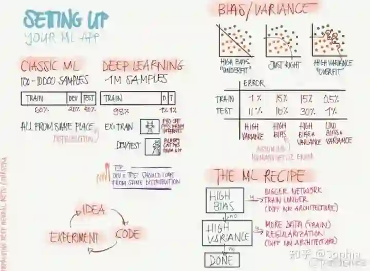 那么部署你的机器学习模型需要注意些什么?下图展示了构建 ML 应用所需要的数据集分割、偏差与方差等问题。