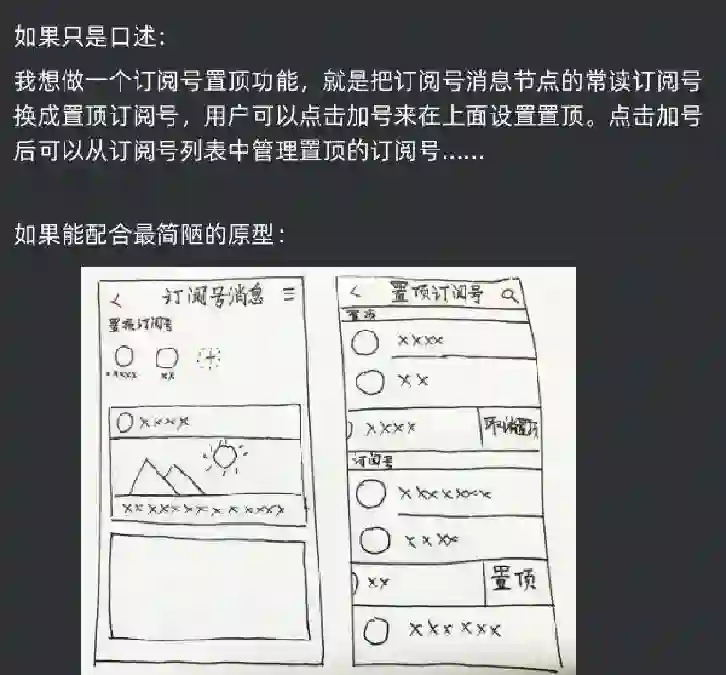 哪怕这个原型图是一个手绘的、很简陋的原型,也比一大段文字来的容易理解。