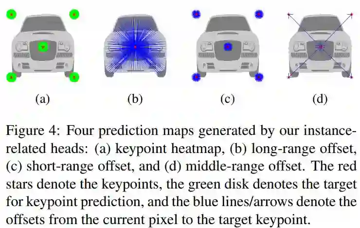 我们为目标实例采用基于关键点的表示。受 PersonLab 启发,我们定义了四个预测 heads,用于实例分割:【1】The keypoint heatmap 【2】The long-range offset map 【3】The short-range offset map 【4】The middle-range offset map。 这些预测的重点是预测每个像素与其相应实例的关键点之间的不同关系,我们将其融合以形成类别不相关的实例分割。
