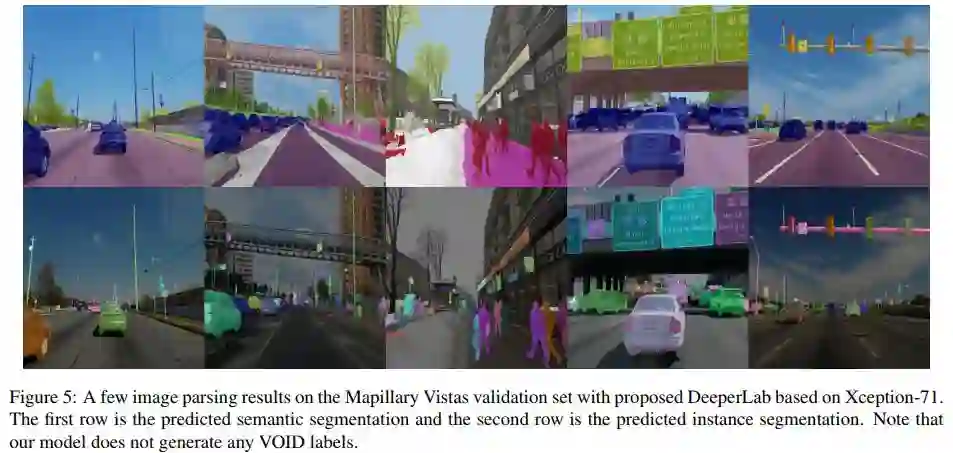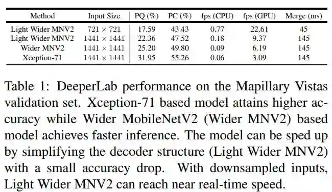 2)我们基于提出的设计策略,提出了一种高效的 single-shot, bottom-up image parser:DeeperLab。例如,在 Mapillary Vistas 数据集上,基于Xception-71 [5,6,7]的模型实现了31.95%PQ(val)/ 31.6%(测试)和55.26%PC(val),每秒3帧(fps)在GPU上。我们的新型更广泛的基于MobileNetV2 [8]的模型可以实现接近实时的性能(GPU上为22.61 fps),当然精度会有所降低。