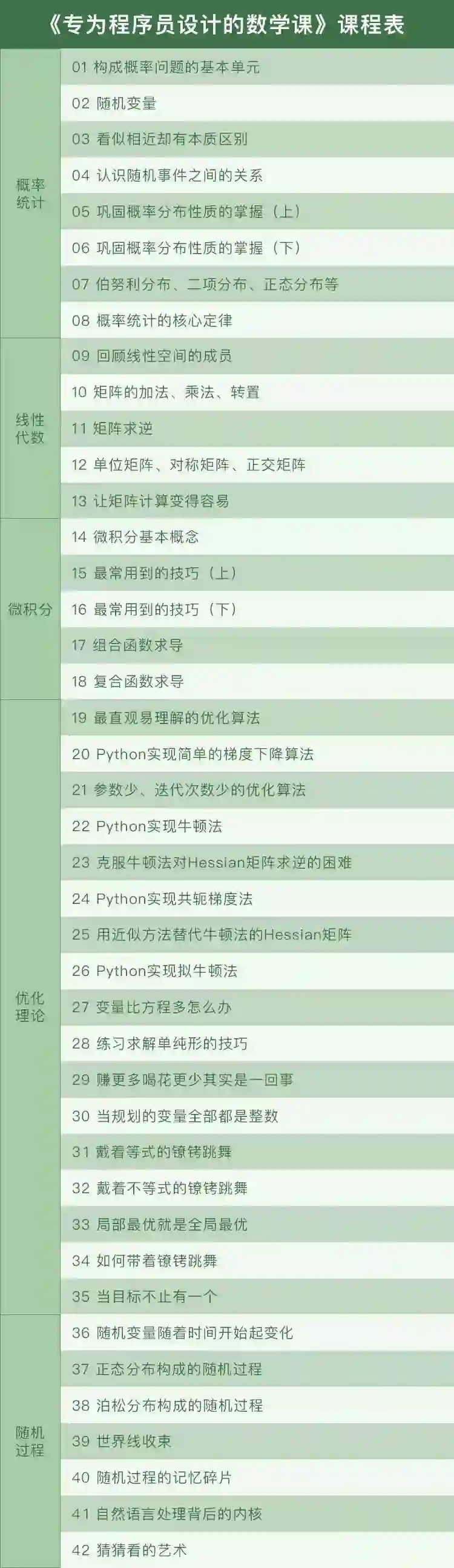 关于程序员学习数学,我不建议你把将大学的相关书籍拿出来啃一遍,耗费大量时间不说,关键是跟实际应用无法结合,结果往往是:该看的忽略了,不该看的费了半天劲还用不上,等过一阵字就又忘了。