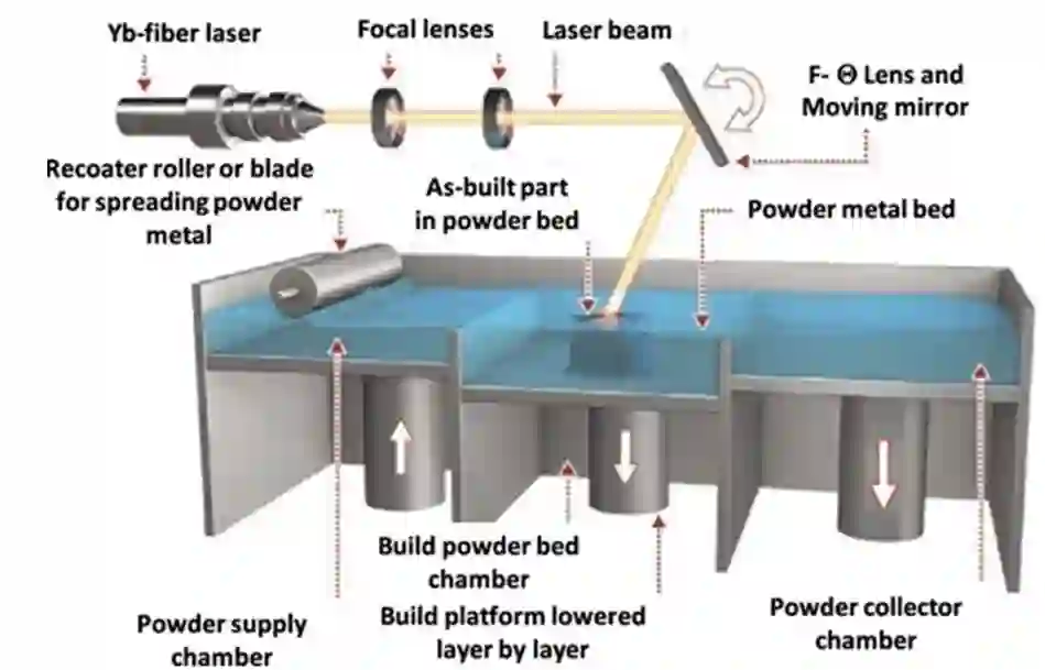该项目将焦点集中在一个特定的3D打印机模型上,以确定对DT架构至关重要的传感器和数据的类型。该团队选择了一种打印机模型,这种模型目前在美国国防部的几个实验室使用,通用电气的M2系列5。这台打印机使用直接金属激光熔化(DMLM)来制造打印。DMLM制造过程包括熔化金属粉末颗粒,以创建超薄池,并在冷却时固化(GE Additive 2021)。这种工艺生产的部件重量减轻,同时保持强度、耐久性和精度,以满足海军对部件的AM要求。DMLM 3D打印机的主要组成部分如图2所示,包括激光器、焦透镜、准直器、反射镜、重拍刀片,以及供粉室、粉床搭建、用粉收集三个粉末室。准直器和焦距透镜一起工作来聚焦激光。复盖机刀片用于分散、磨平和压平层间的金属粉末。除了这些部件外,打印机在打印过程中还必须有优质的气流,并保持惰性气体环境;GE M2接口使用氮气。该团队专注于使用DT系统来利用3D打印机的嵌入式传感器,以及放置在打印机和船舱中的传感器,以确定影响系统可用性和打印部件质量的因素。