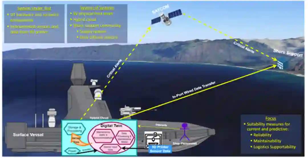 一个操作视图,或OV-1图,这是一个高级的操作概念图,被创建来说明这个顶点项目的操作概念(见图1)。该图描述了系统之间的系统交互,包括载人水面舰艇上的3D打印机,船上人员,混合云,卫星通信(SATCOM)和岸上支持,包括供应链系统。DT接收来自3D打印机的传感器输入,以及船上的环境数据,以预测必要的维护,以及打印部件的质量。包含DT的混合云存储原始和处理过的数据,以维护历史文物,并通过SATCOM或有线连接向船舶人员和岸上支持提供警报,当水面船只进入港口时。警报有助于向船舶人员提供有关即将进行的维修的必要信息,或提供岸上支持活动需要准备的部件,从而减少行政和后勤准备时间。