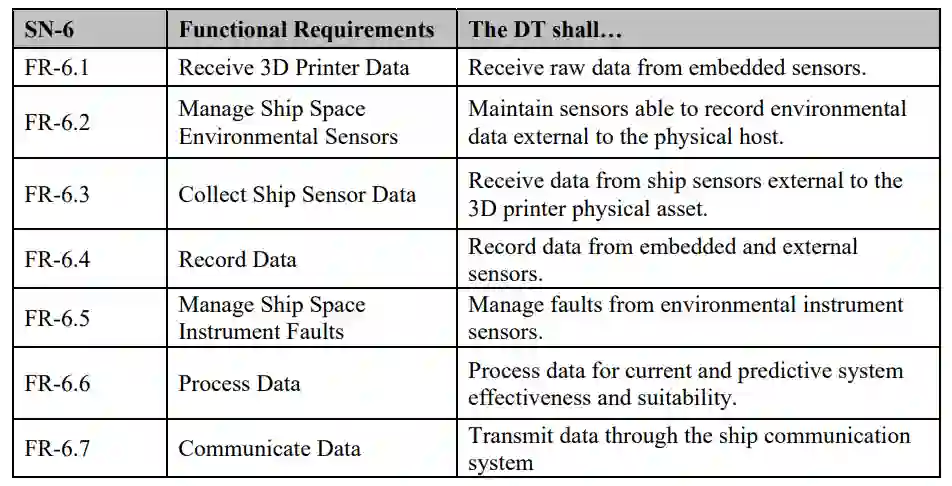该团队最初进行了一项利益相关者分析,其中考虑了将DT用于海军系统的利益相关者。这些利益相关者的需求是基于主要赞助商(海军水面作战中心Hueneme港代码00T)和NPS顾问的指导。利用涉众的需求,进行了需求分析。基于DT系统的期望功能,分析确定了功能性/非功能性需求,以及外部接口。该团队将DT系统的功能需求缩小为7个高级需求,如表1所示。