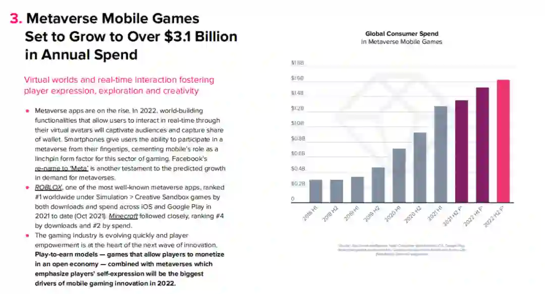 元宇宙应用程序(如 Roblox、Minecraft)的消费者支出将超过 31 亿美元;