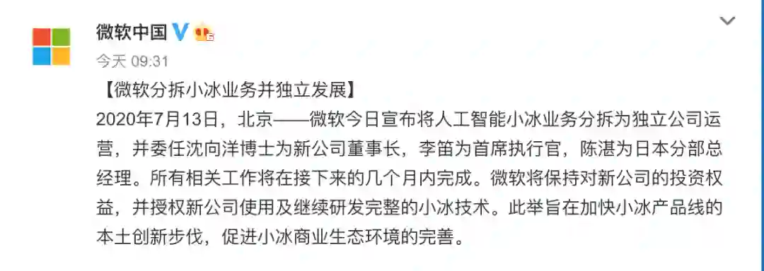 微软小冰单飞的消息流传了一个月,终于尘埃落定。