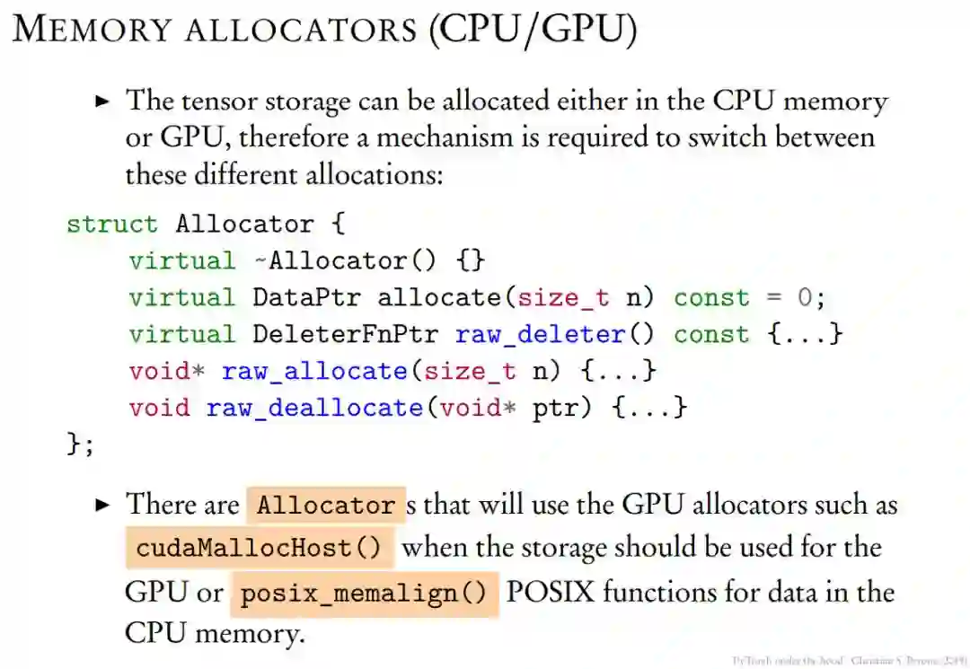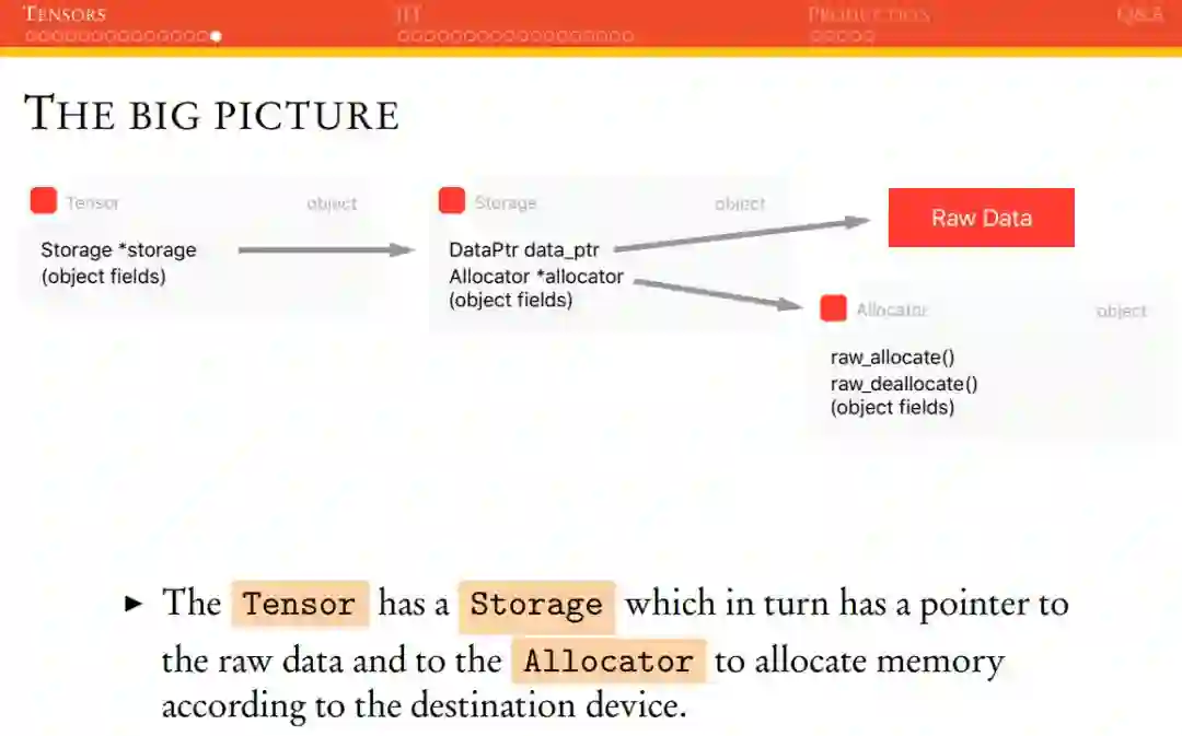 张量的实际原始数据并不是立即保存在张量结构中,而是保存在我们称之为「存储(Storage)」的地方,它是张量结构的一部分。一般张量存储可以通过 Allocator 选择是储存在计算机内存(CPU)还是显存(GPU)。