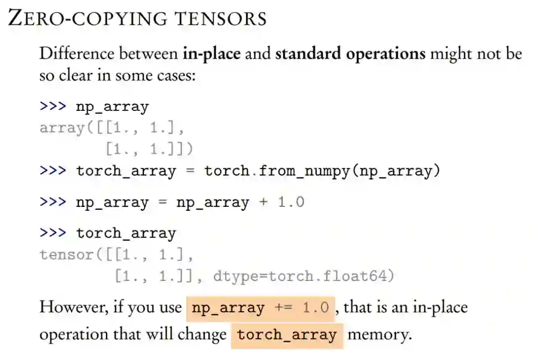 Zero-Copying 的形式确实能省很多内存,但是如上所示在位(in-place)和标准运算之间的区别会有点模糊。如果用 np_array = np_array +1.0,torch_array 的内存不会改变,但是如果用 np_array += 1.0,torch_array 的内存却又会改变。