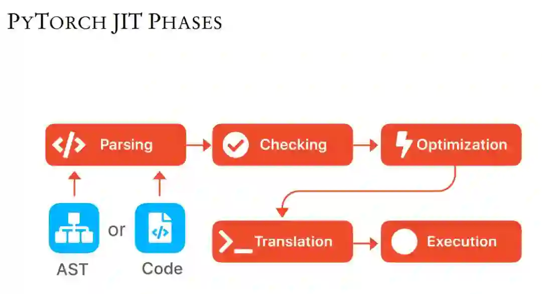 如下所示 JIT 主要会输入代码或 Python 的抽象句法树(AST),其中 AST 会用树结构表征 Python 源代码的句法结构。解析可能是解析句法结构和计算图,然后语法检测接连着代码优化过程,最后只要编译并执行就可以了。