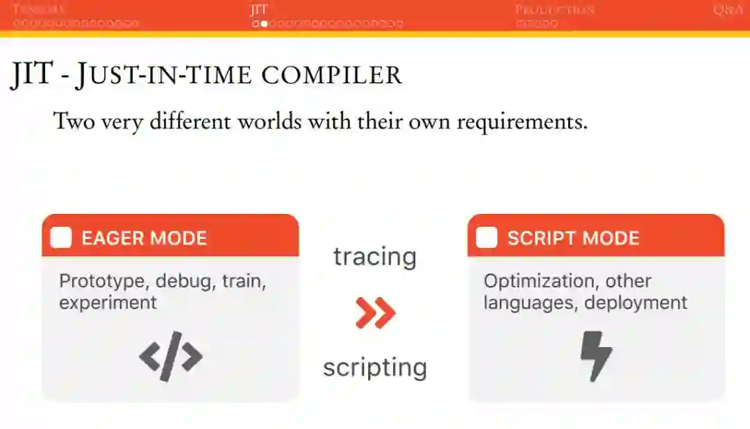 因为 PyTorch 是即时运行模式,这表明它很容易 Debug 或检查代码等。在 PyTorch 1.0 中,其首次引进了 torch.jit,它是一组编译工具,且主要目标是弥补研究与产品部署的差距。JIT 包含一种名为 Torch Script 的语言,这种语言是 Python 的子语言。使用 Torch Script 的代码可以实现非常大的优化,并且可以序列化以供在后续的 C++API 中使用。