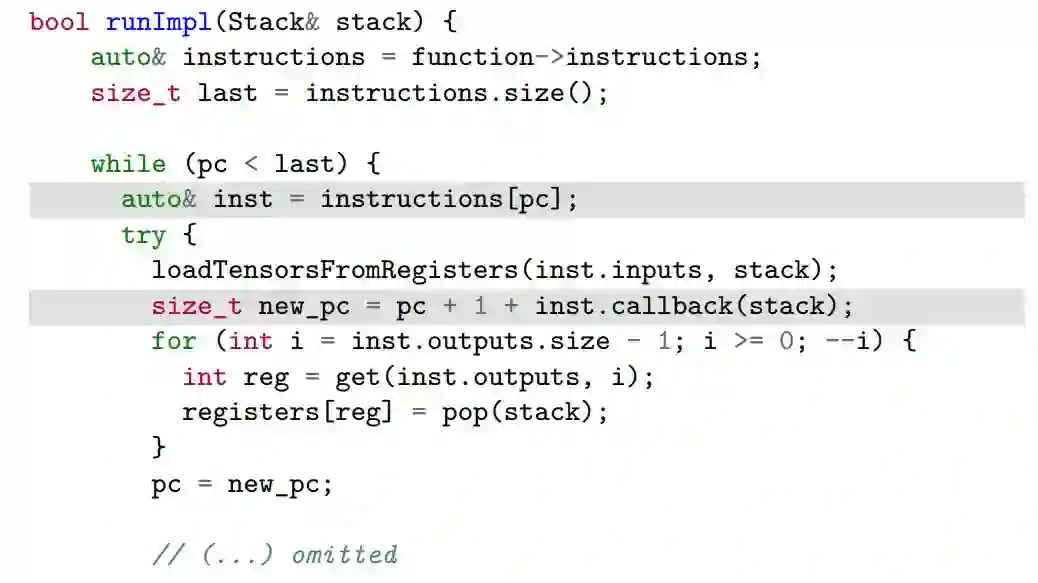 和 Python 解释器可以执行代码一样,PyTorch 在 JIT 过程中也有一个解释器执行中间表征指令:
