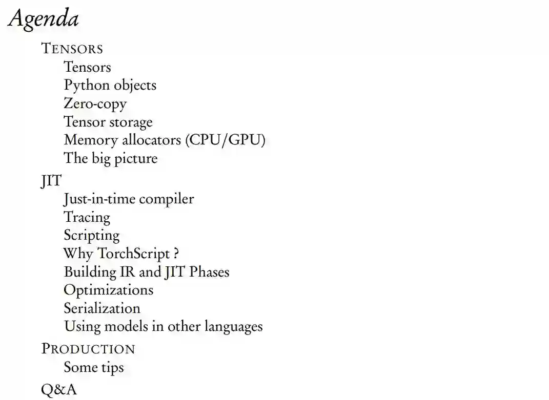 如下所示为这次演讲的主要议程,它主要从张量和 JIT 编译器出发介绍底层运行机制:
