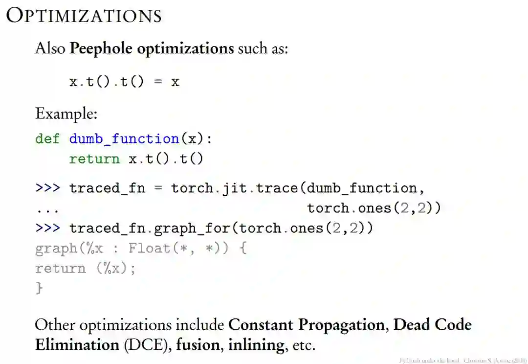 其中优化可以用于模型计算图,例如展开循环等。在如下所示的 Peephole 优化中,编译器仅在一个或多个基本块中针对已生成的代码,结合 CPU 指令的特点和一些转换规则提升性能。Peephole 优化也可以通过整体分析和指令转换提升代码性能。