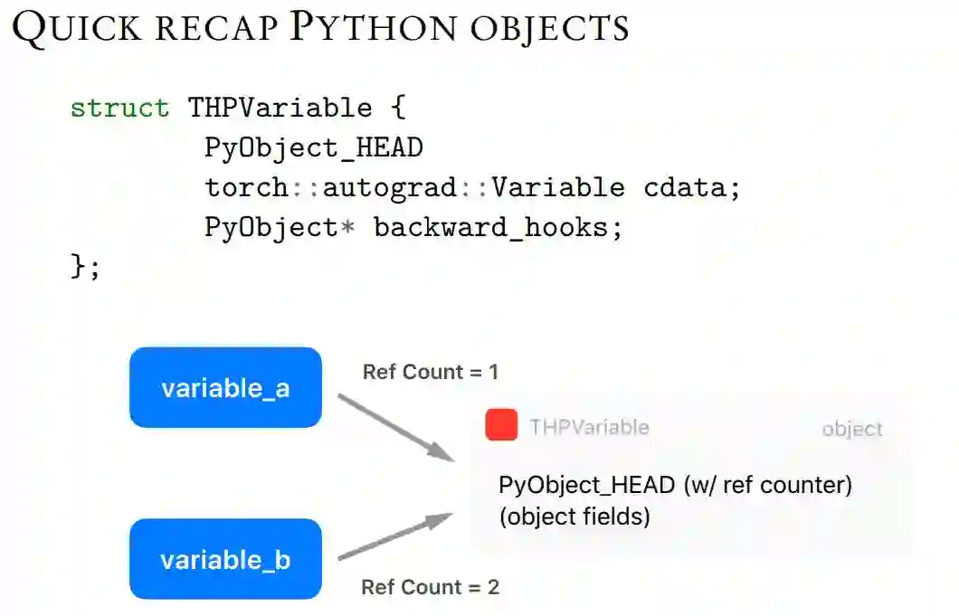 为了定义 C/C++中一个新的 Python 对象类型,你需要定义如下 THPVariable 类似结构。其中第一个 PyObject_HEAD 宏旨在标准化 Python 对象,并扩展至另一个结构,该结构包含一个指向类型对象的指针,以及一个带有引用计数(ref count)的字段。