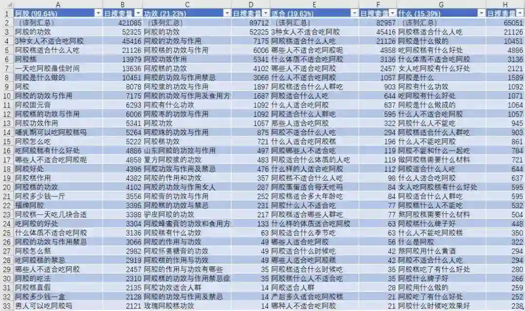 从这份数据能看到,“阿胶”这个代表整个类目的词语,每天的搜索量也只有8078。搜索引擎上所有的行业都是这样的,用户搜索的80%的词,字数都是很多的。