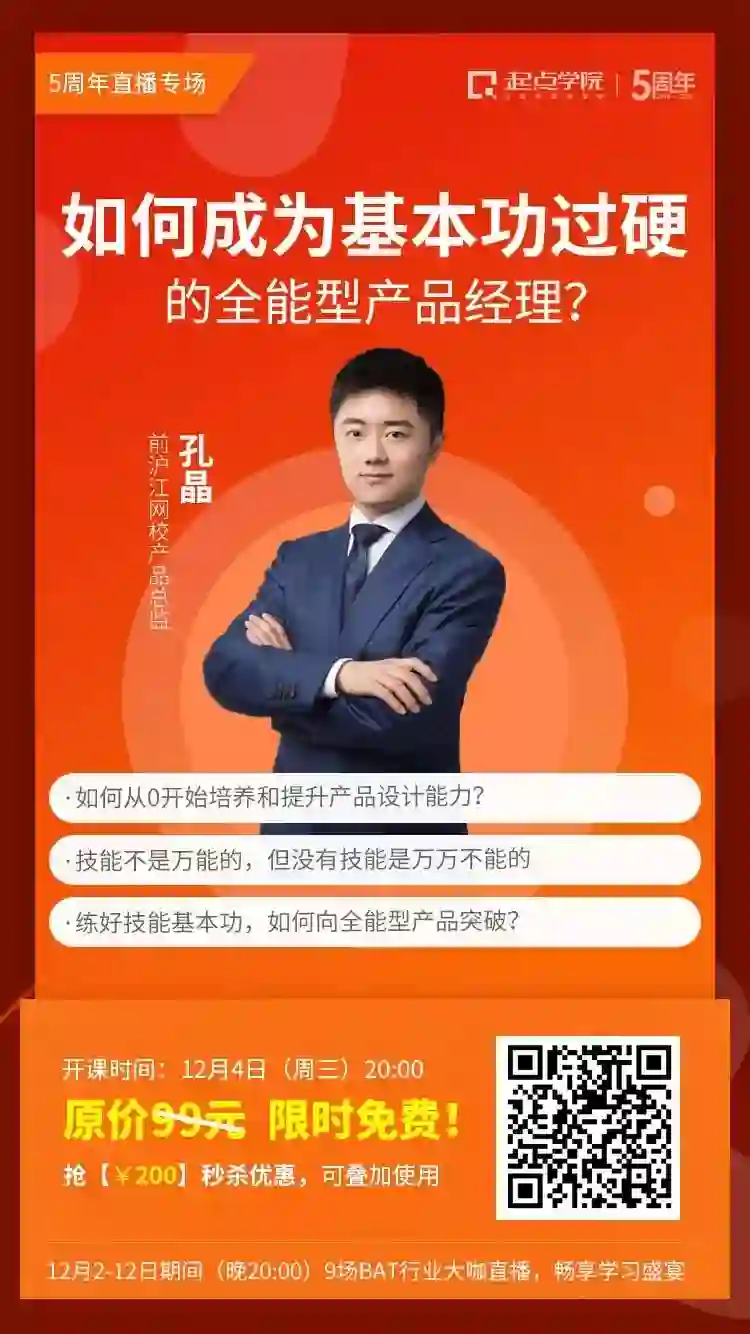 12月4日(晚,20:00)《全能型产品经理培养专场》,扫码即可预约!