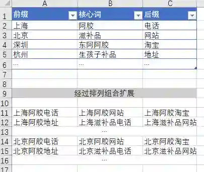这种方法就是大家去定义一些和你的业务相关的核心词,如阿胶、滋补品等,再定义一些前缀和后缀等,然后再排列组合。这样出来的词就是: