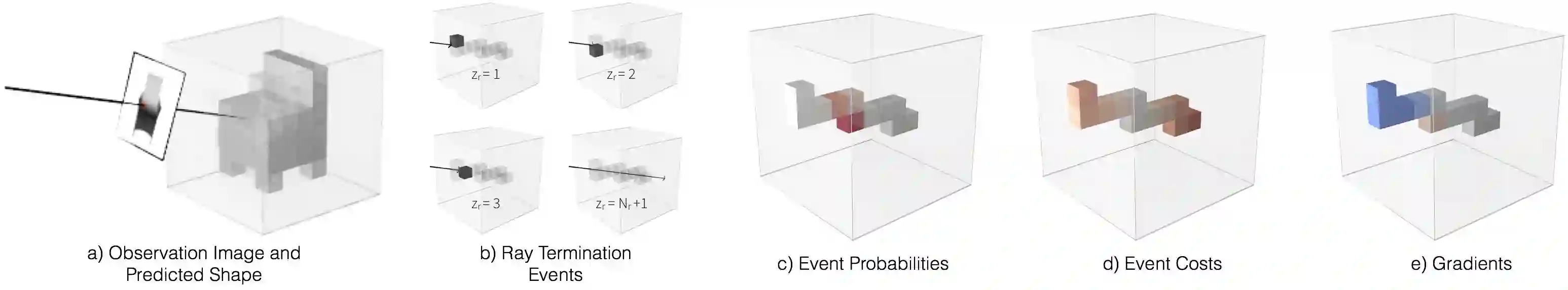 上图描绘了形式化射线一致性的各方面成本。a) 我们测量一致性的三维形体预测和样本射线。b,c) 我们通过三维形体和计算事件概率追踪射线,即不同路径上射线最终投影点的概率。d) 我们可以度量射线终止事件和该射线可用信息之间的不一致性成本。e) 通过间射线一致性成本定义为时间成本期望值,我们可以计算梯度以更新为更具一致性的预测。在这个案例中,我们可视化了一个深度观察 O,我们方法的优势在于它可以通过简单定义相应的事件成本函数而允许合并多种观察(如颜色图片、前景等)。