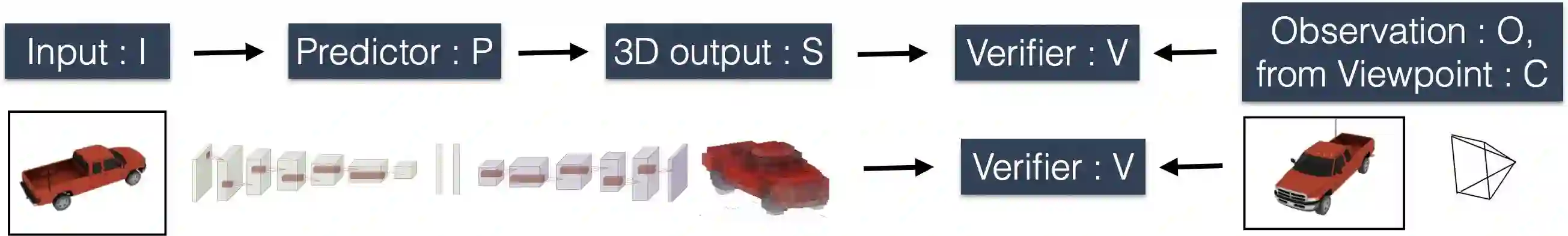 为了说明训练过程,在预测器 P 和几何输出之间设置了一个简单的策略网络,检验器 V。我们给 P 输入一个单一的图像 I,而且它预测出了一个 3D 形状 S. V,然后此 3D 形状 S. V 会被给予预测结果 S,和一个来此不同相机视角 C 的观测结果 O,它会使用几何方程来验证这些结果是否是一致的。我们让 P 去预测 S,从而能通过 V 的一致性检测。其中的核心就是由于 P 不知道(O,C)将要用来验证其预测结果,它将不得不去预测与所有可能观察结果相一致的 S(与未知的真实值 Sgt 相似)。这就使我们要定义下面的训练算法,从而在仅使用多视角监督(multi-view supervision)的情况下来学习从 2D 到 3D 的预测结果。
