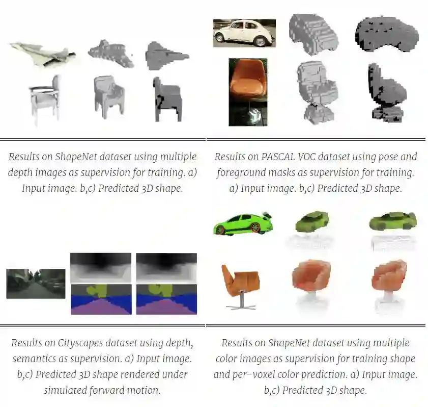 构建单幅图片 3D 推断的计算模型一直是计算机直觉中探讨的问题。早期的 Blocks World(论文:Machine perception of three-dimensional solids)或 3D surface from line drawings(论文:Interpreting Line Drawings as Three-Dimensional Surfaces)等项目都是利用几何线索的显式推理来优化三维结构。近年来,利用监督学习方法可以获得更加真实的设定和三维表征的定性推断(Hoiem et al.)或定量推断(Saxena et al)。在真实设定中获得优秀成果的趋势已经随着目前基于 CNN 实体(e.g. Eigen & Fergus, Wang et al.)的发展而进步,但它是以增加直接 3D 监督为代价的,所以这种范式相当有限。获得这种大规模监督数据的成本是巨大的,因此我们希望我们的计算系统能像人一样不需要 3D 监督而学习进行 3D 预测。