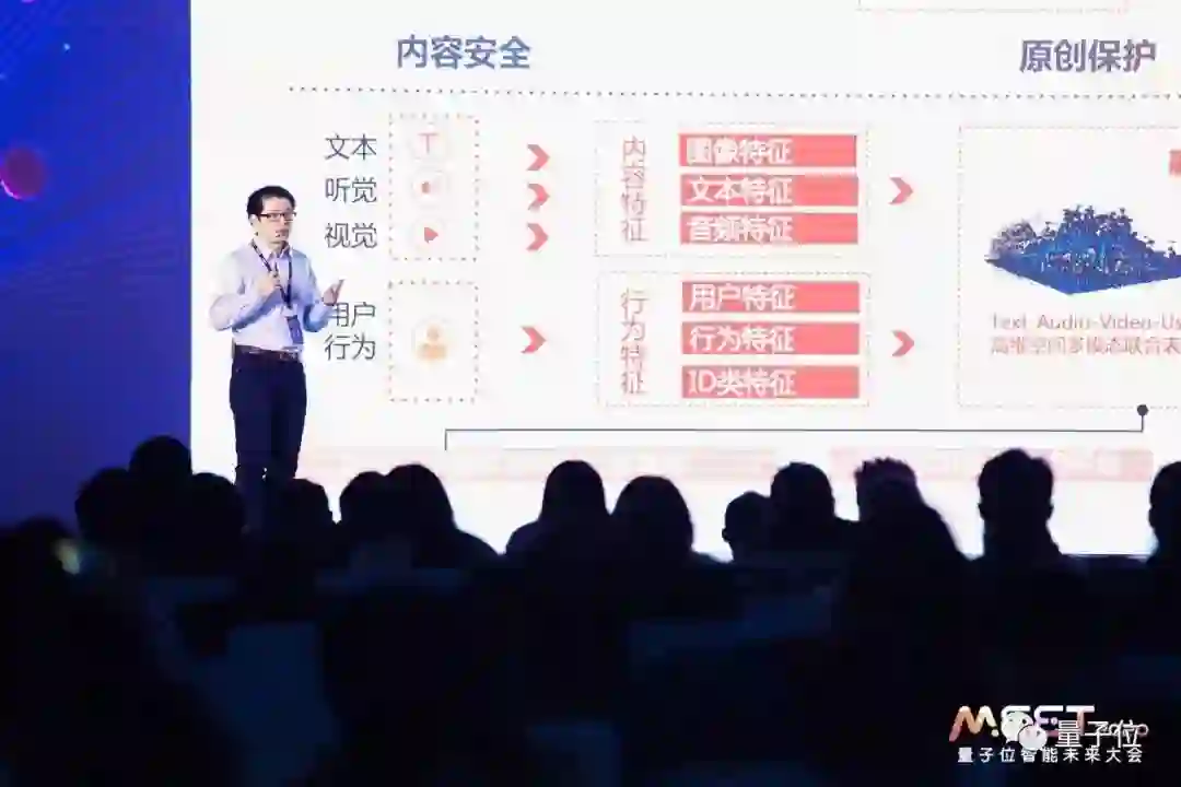 在快手,提到内容理解,大家首先会想到风控,需要实时检测不雅视频、不当言论。但一个挑战在于,我们的内容形态是视频,视频里包含语音、图像、动作、评论等等,这是一个多模态信息,我们需要对多模态信息做综合性的分析和理解,这就提出了比以前单一的信息源更大的挑战。