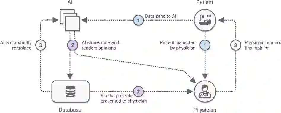 图 5:临床部署。该示例工作流程展示了 AI 增强工作流的积极效果,以及可建立起的信任。人工智能的预测结果为医生提供了直接价值,而随着收集到的数据增加,这种能力还会不断提升。