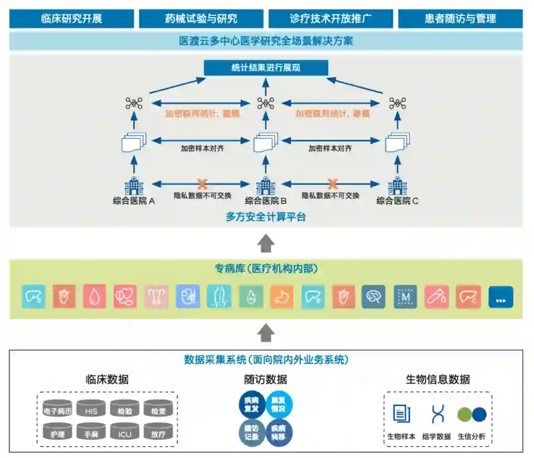 如果这种联邦学习方法或方案能再加上一个前缀——「基于 TEE」,那么它还会收获更多强化功能,例如它可以通过硬件环境上的隔离,使安全保护机制独立于软件应用、操作系统或硬件配置之外,使其保护的对象可以更好地应对来自硬件驱动程序、虚拟机乃至操作系统的攻击。再如,它的用途,不仅仅是可以提供数据运行态全链路的保护,来确保数据中的机密、隐私和完整性得到更强的防护,它还能对指定的应用程序或算法的代码进行同样可靠的防护;又如,它还拥有更完备的远程鉴权能力,能让相关数据和密钥的传递更为可靠;最后,相比那些非硬件加速支持的联邦学习及多方隐私计算方案,有 TEE 加持的方案,往往在兼顾安全防护能力和提升数据处理性能上有更好的表现。 正是这些优势,给了众多医疗科研机构选择基于 TEE 构建自己的联邦学习系统的理由。 以多年来一直深耕医疗 AI 与大数据技术创新的医渡云为例,这家公司基于联邦学习等隐私计算方法打造了一个多方安全计算解决方案, 自下而上包含面向院内外业务系统的数据采集系统、进行数据加工治理的专病库以及开展多方隐私计算的安全计算平台等几个部分,其中的多方安全计算平台也支持 TEE 方式进行构建。