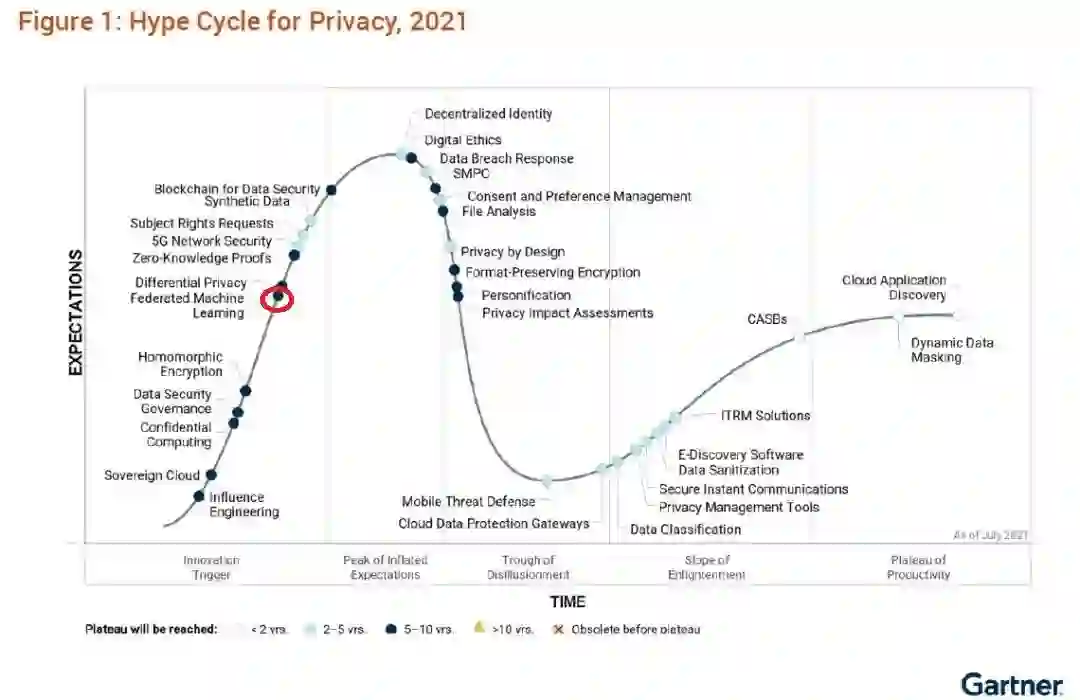 Gartner技术成熟度曲线 在应用方面,除了我们前面提到的医疗和金融场景,王健宗还系统地总结了联邦学习在物联网、政务等领域的应用。从这里也可以看出,联邦学习技术的应用范围正在不断扩大,越来越多企业正放下顾虑,更放心地参与到共同的 AI 应用开发中来。这背后,以 TEE 为代表的安全计算实现方案功不可没。