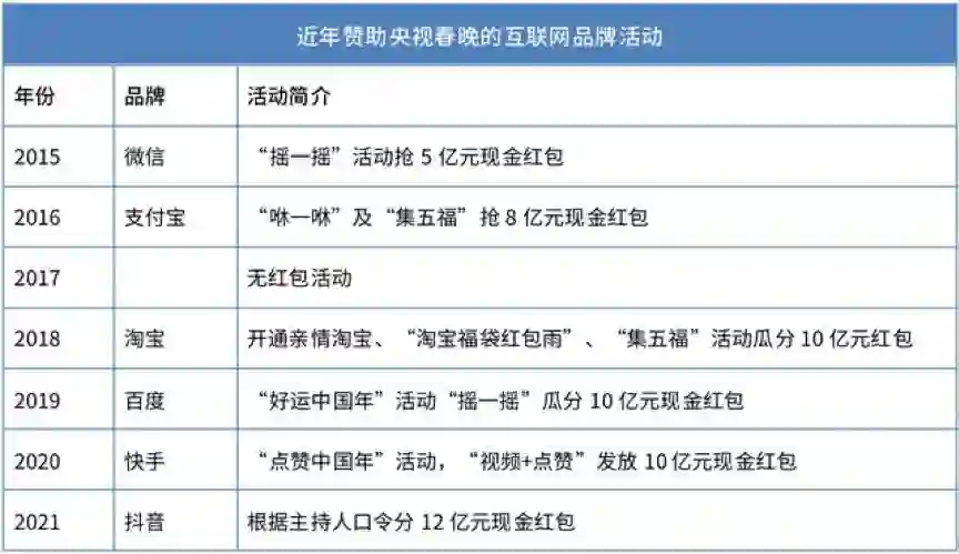 自2015年微信开启春晚抢红包后,每年有一家顶尖互联网公司走上舞台,给十几亿人发红包,今年是京东,去年是抖音,2020年是
