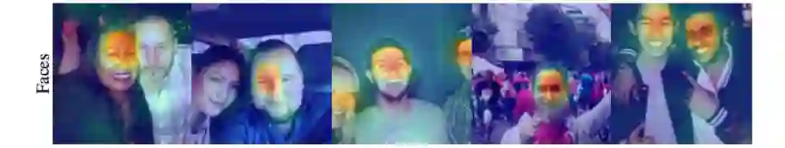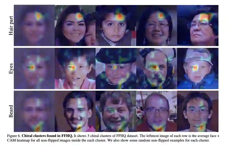 在互联网图片集上,神经网络在镜像翻转识别上取得了高达60%-80%的精度。作者着重分析了Instagram图片上的视觉手性现象。在不用随机剪裁(random cropping)时,神经网络在测试集上取得了高达92%的精度。然而因为有JPEG压缩失真的可能性存在(JPEG edge artifact一般出现于图片的边缘),作者同样使用随机剪裁进行了训练,并仍旧取得了高达80%的精度。考虑到大量Instagram图片有配文字,而文字是最明显的视觉手性现象,作者用文字识别器滤除了Instagram中含有文字的图片重新进行了训练,但仍旧在测试集上取得了74%的高精度。值得一提的是这些训练出来的模型具有一定程度的泛化能力,可以不经训练,在其他的互联网图片集(Flickr F100M)上取得高于50%的精度。作者在Instagram图片集上进行了手性特征聚类,并挑选了一系列与我们生活相关的典型视觉手性现象进行讨论。1、手机对着镜子自拍是人们最爱做的事。此类照片具有视觉手性,因为手机的摄像头一般固定在手机背面的一侧(因品牌而异),同时由于多数人是右撇子,一般都以右手持手机进行自拍。 2、吉他几乎大多数的吉他手都以右手拨弦,左手持把。3、手表手表一般都被带在人们的左手侧。4、男士衬衫领子男士衬衫的扣子一般处于右侧。5、上衣口袋正装上衣的口袋几乎无一例外处于身体左侧,为了更好地服务于占大多数的右撇子。6、人脸更令人吃惊的是,类激活映射方法在大量的人脸上出现了较强的反应,说明人脸中视觉手性的存在。多数情况下人脸通常被认为是对称的:此届CVPR 2020另一篇best student paper(Unsupervised Learning of Probably Symmetric Deformable 3D Objects from Images in the Wild)更是将人脸视为了轴心对称的物体,并以此为线索来进行3D重建。需要强调的一点是,这些视觉手性现象在每张图片中看似孤立,但神经网络仍有可能会利用多种不同的线索来对图片是否翻转进行判断。为了深入了解人脸的视觉手性现象,作者在人脸数据集上进行了孤立训练。作者在Flickr-Faces-HQ (FFHQ)人脸数据集上进行了训练,并在测试集上取得了高达81%的精度,并利用手性特征聚类对人脸中的视觉手性现象进行了初步的探讨:1)刘海分界处人们一般用右手来分理刘海,这会导致刘海的朝向向一侧偏移,并出现视觉手性现象。2)眼睛人们在看向物体时倾向于用一只主视眼进行瞄准,这样会导致人们的目光在进行拍摄时出现偏移。多数人的主视眼为右眼,而这一现象可能是导致视觉手性现象的成因。3)胡子与头发一样,可能与人们习惯于用右手理胡子有关。作者提到,文中对以上的视觉手性现象的讨论均为初步的分析,而人脸中仍有大量的视觉手性线索值得被发掘。