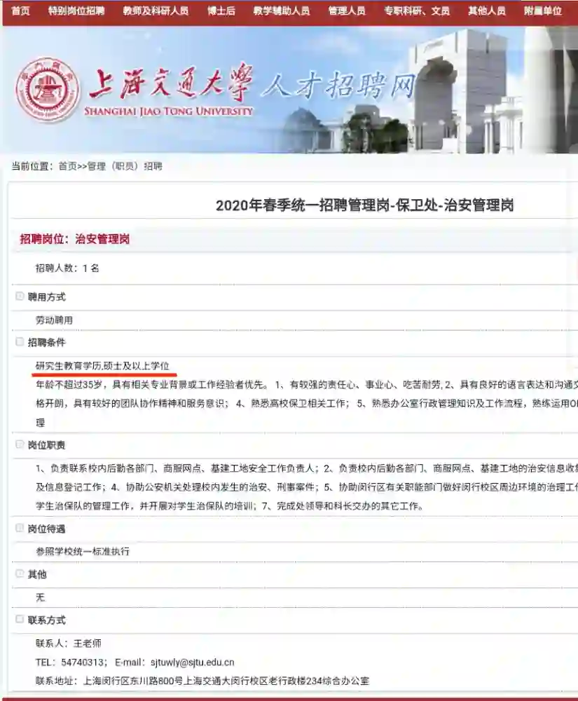 近日,上海交通大学在官方网站发布一则招聘启事:该校保卫处治安管理岗招聘一名工作人员,要求研究生教育学历,硕士及以上学位。