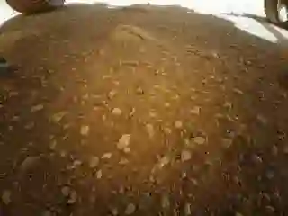 2021 年 4 月 3 日,机智号无人机彩色相机拍摄的首张照片,此时机智号还在火星车底,照片中拍到了火星车两个轮子。