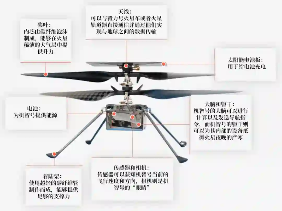 在火星上起飞是个大问题,由于火星表面和地球环境相差很大,火星表面重力大约只有地球表面的 1/3。为了让机智号能够在火星上飞行,必须足够坚固,承受高转速对机体结构的考验。为此,机智号的旋翼、支脚都使用碳纤维构成。