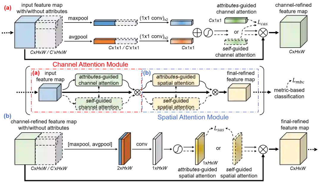 AGAM的总体架构。取决于图像的属性标注是否可得,属性指导分支和自我指导分支中的一支被选择。输入的特征依次经过 (a) 通道注意力模块和 (b) 空间注意力模块来获得最终改善的特征。