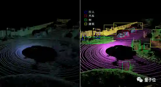 △ 左为原始点云,右为语义分割点云,清晰识别人、车、树等物体