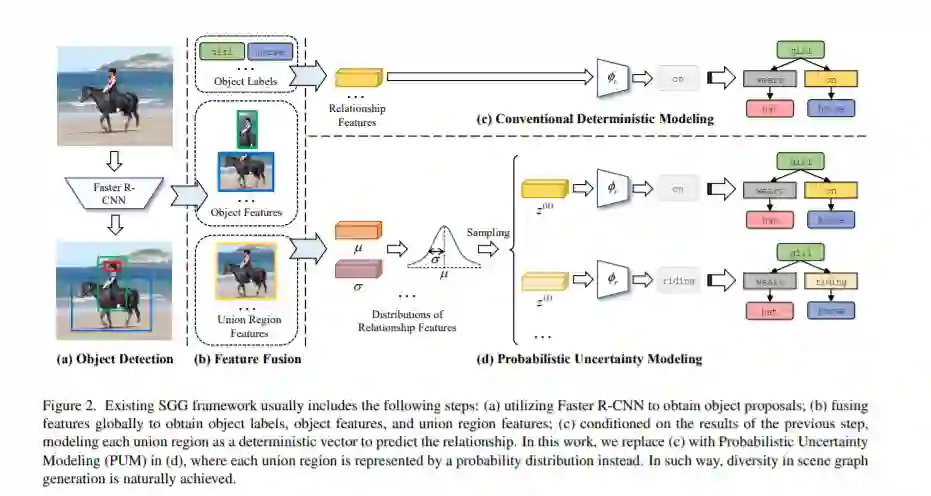 具体来说,受语言学知识的启发,我们将歧义分为三类:同义歧义、上下义歧义和多视点歧义。这种模糊性自然会导致隐性多标签问题,也激发了对预测多样性的需求。在这项工作中,我们提出了一个新的即插即用概率不确定性建模(PUM)模块。它将每个联合区域建模为高斯分布,其方差度量相应视觉内容的不确定性。与传统的确定性方法相比,这种不确定性建模带来了特征表示的随机性,使得预测具有多样性。作为一个副产品,PUM还能够覆盖更细粒度的关系,从而减轻对频繁关系的偏见。