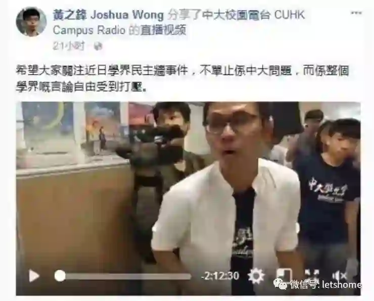 而挂在“香港众志”官网图上的男主角——因“煽惑他人参与非法集会罪”和“参与非法集会罪”被判入狱的黄之锋,身处牢狱之中仍不忘刷一波存在感。特意在FB上发文宣扬,“希望大家关注近日学界民主墙事件,不但只是中大问题,而是整个学界的言论自由受到打击。”